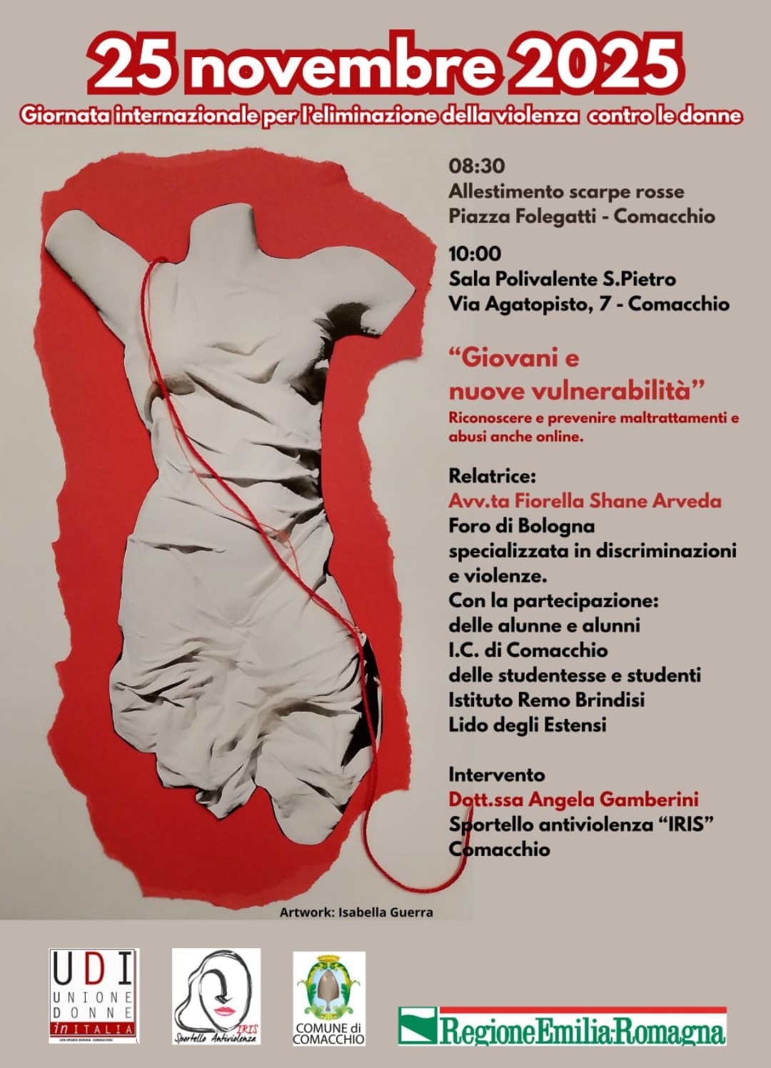 Dalle 10, sempre di martedì 25 novembre, in Sala Polivalente a Comacchio, dopo l'allestimento, alle 8,30, delle scarpe rosse in Piazza Folegatti, l'Udi (Unione Donne Italiane) aprirà l'incontro dal titolo "Giovani e nuove vulnerabilità" - Riconoscere e prevenire maltrattamenti e gli abusi anche on line.